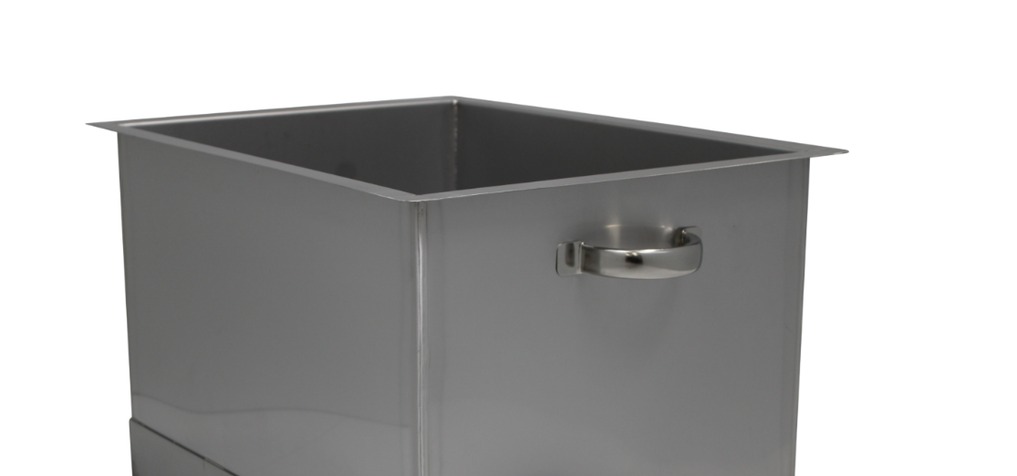 大型の角型タンクです。各コーナーにRが付いていて洗浄し易いサニタリータイプです(取手部除く)